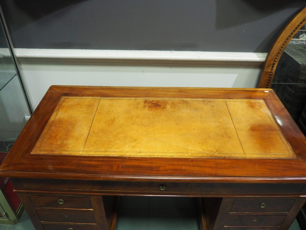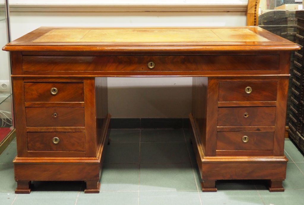 Bureau ministre XIXème en acajou et placage d'acajou flammé, ouvrant à sept tiroirs, dessus cuir. Dim. 77 x 140 x 71 cm