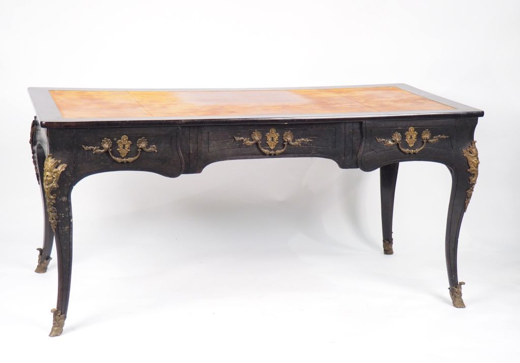 Bureau plat Louis XV en bois noirci, double face , ouvrant à trois tiroirs en ceinture, ornementation de bronze à décor d'espagnolettes, dessus bois rapporté. Dim. 74,5 x 157 x 75 cm (petits accidents, restaurations)