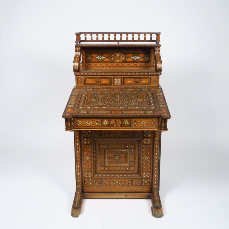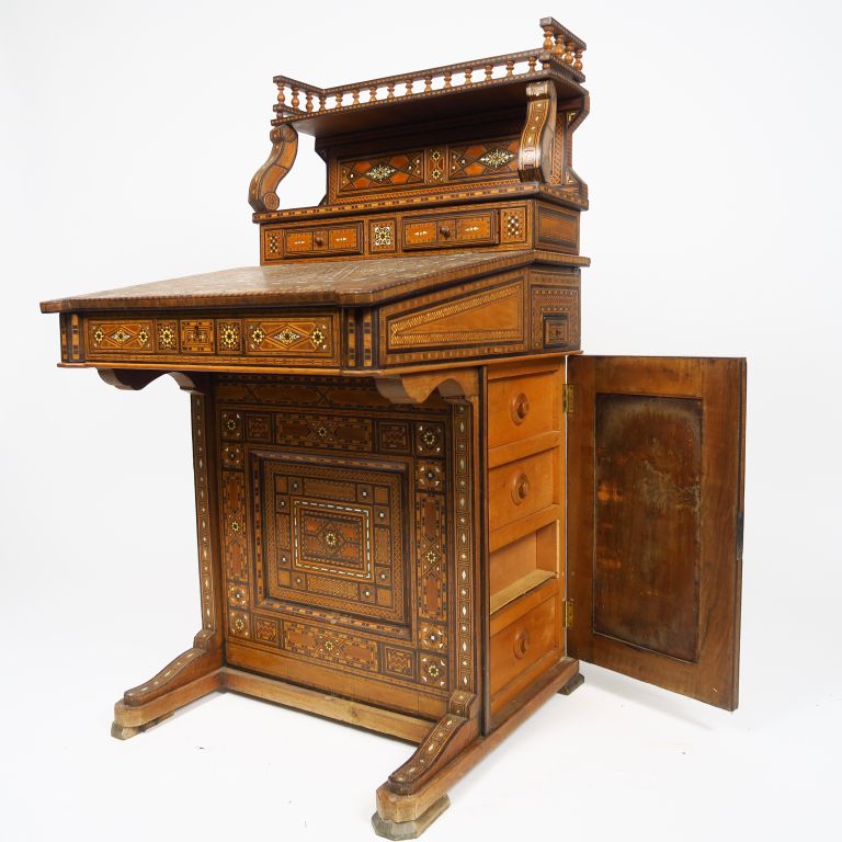 Bureau syrien 1900 en marqueterie ouvrant à deux tiroirs, un abattant et une porte latérale. Dim. : 67 x 114 x 61 cm.