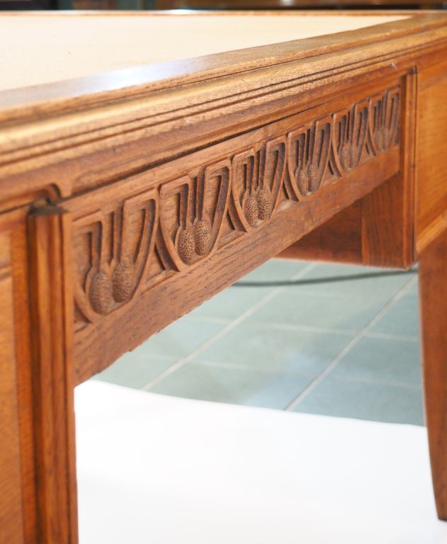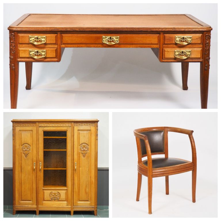 Cabinet de travail Art Nouveau en chêne sculpté à décor de houx, très belles poignées de tirage en bronze comprenant : - une bibliothèque Dim. 180 x 160 x 43 cm - un bureau ministre Dim. 75 x 158 x 89 cm - un fauteuil gondole garniture de cuir brun