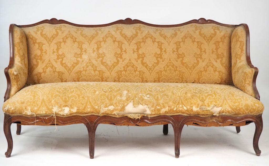 Canapé à oreilles XVIIIème en noyer mouluré, garniture de tissu à décor de rinceaux feuillagés sur fond jaune. Dim. 94 x 184 cm (garniture en mauvais état, entures et traces anciennes d'insectes xylophages)