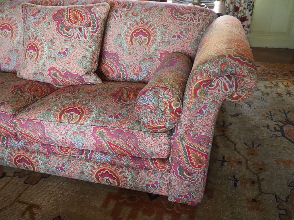 Canapé de style club garniture de tissu à motifs cachemire. Dim. 80 x 210 x 92 cm.