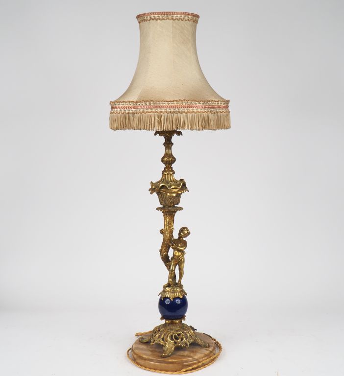 Candélabre en bronze de style Renaissance à décor d'un angelot porte-torchère, sur un socle en onyx brun. H. 62 cm.