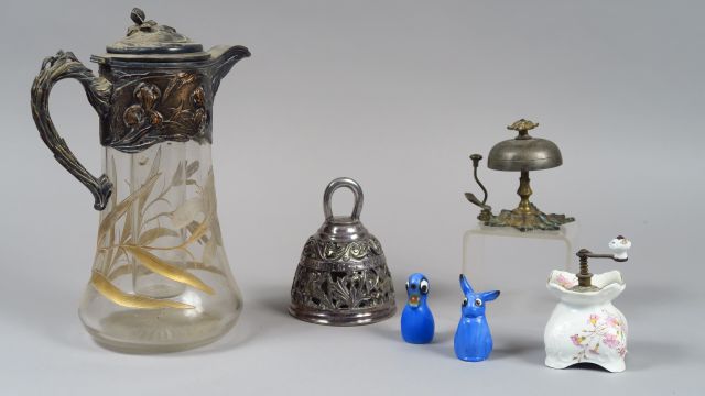 Carafe à jus de fruit de style Art Nouveau sonnette de table Napoléon III moulin à poivre en porcelaine paire de salerons en porcelaine "canard" et "lapin" cloche de style gothique en bronze argenté
