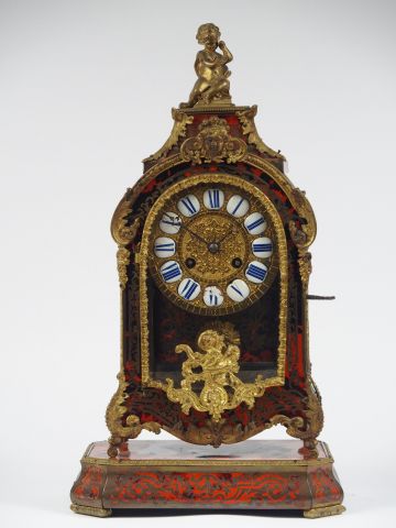 Cartel Napoléon III de style Régence en marqueterie Boulle, écaille rouge et laiton, riche ornementation de bronze doré (quelques manques sur le côté). H. avec socle : 45 cm