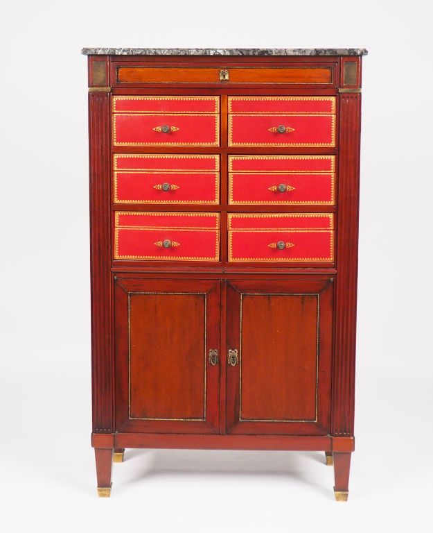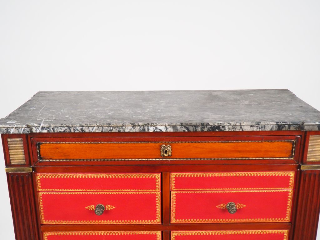 Cartonnier de style Louis XVI en acajou et cuir rouge, ouvrant à 7 tiroirs et 2 petits abattants, dessus marbre. Dim. 142,5 x 82,5 x 36 cm. ,