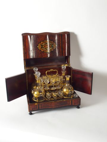 Lot de Cave à liqueur Napoléon III en marqueterie Boulle (accident à un bouch au prix de 300 à 500 € en vente aux enchères par l'hôtel des ventes Primardeco