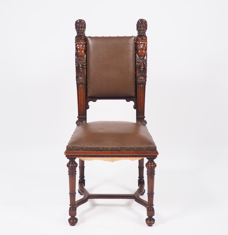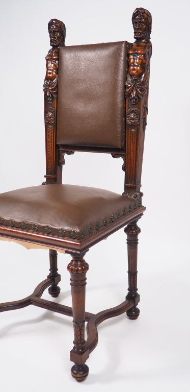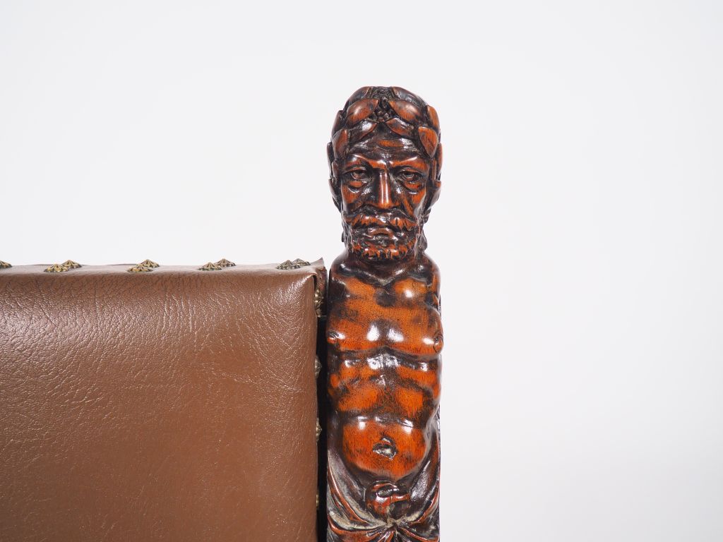 Chaise de style Renaissance en noyer mouluré et sculpté à décor de deux bustes d'hommes auréolés d'une couronne de laurier, garniture de cuir marron. Dim. 112 x 50 x 46 cm.