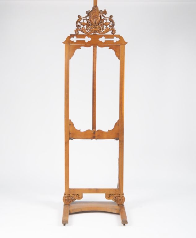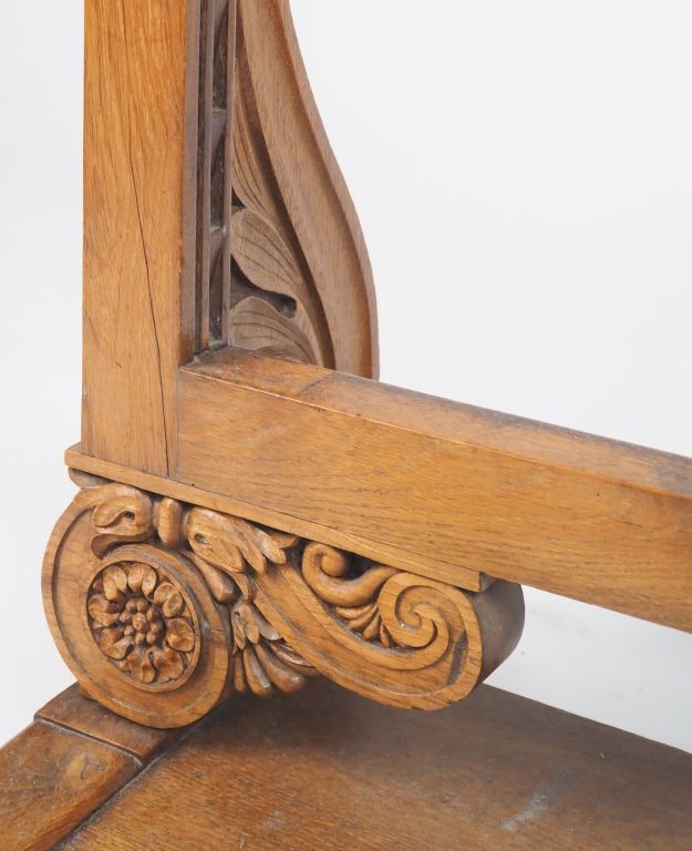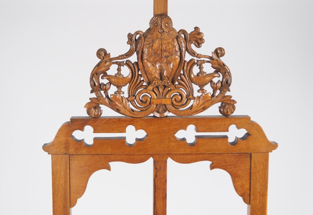 Chevalet XIXème en chêne clair sculpté, à décor de hibou flanqué de deux lampes à huile et de consoles feuillagées.