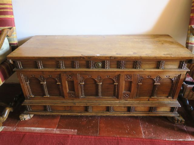 Coffre de style Haute Epoque en noyer à décor d'arcatures
