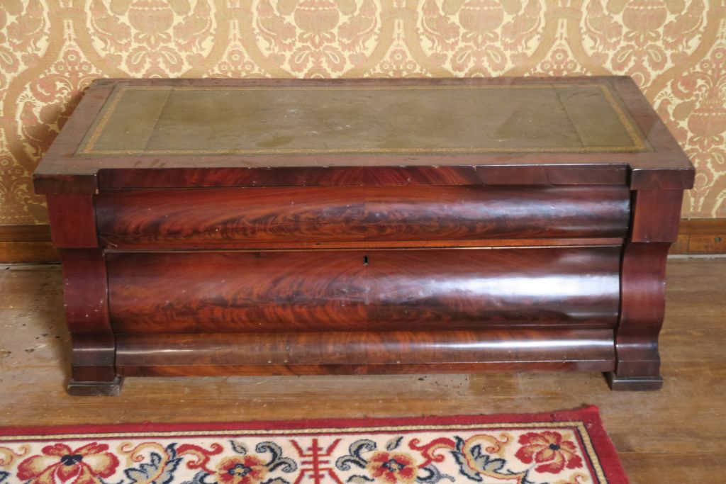 Coffre en acajou flammé dessus cuir, ouvrant à un grand et un petit tiroir. Dim. 48 x 118 x 54 cm.