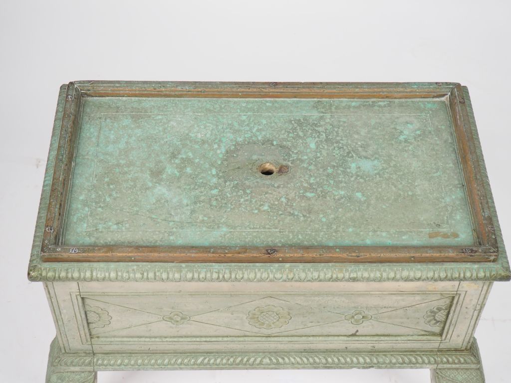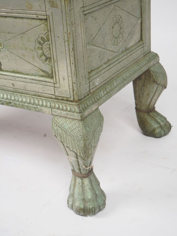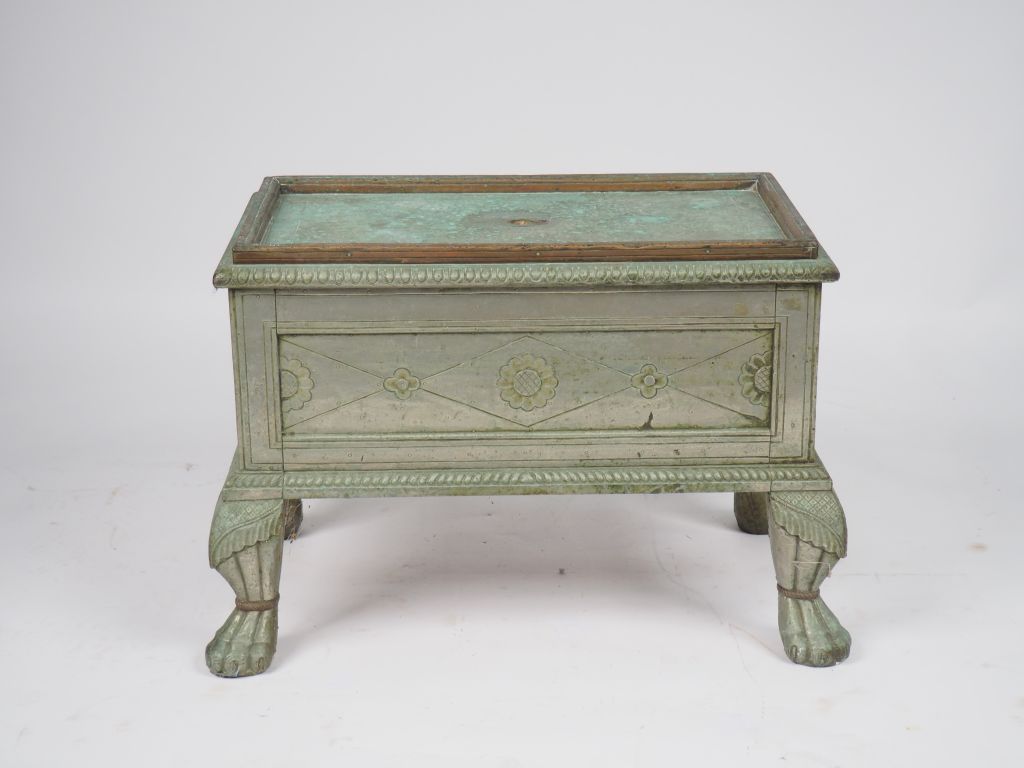 Coffre indien en métal patiné vert, orné de quatre pieds griffe et à décor de fleurs et de godrons. Dim. 41 x 71 x 43 cm.