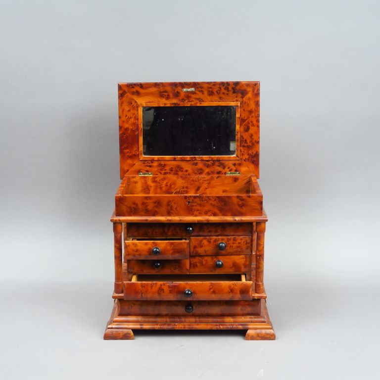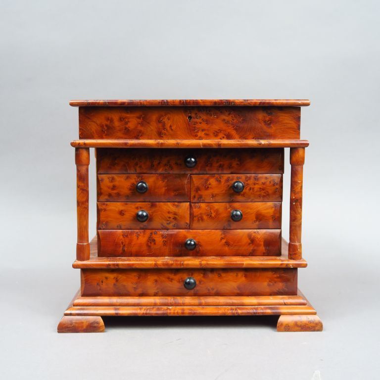Coffret à bijoux de style Empire en placage de loupe de Thuya en forme de commode. Dim. : 30 x 34 x 25 cm.