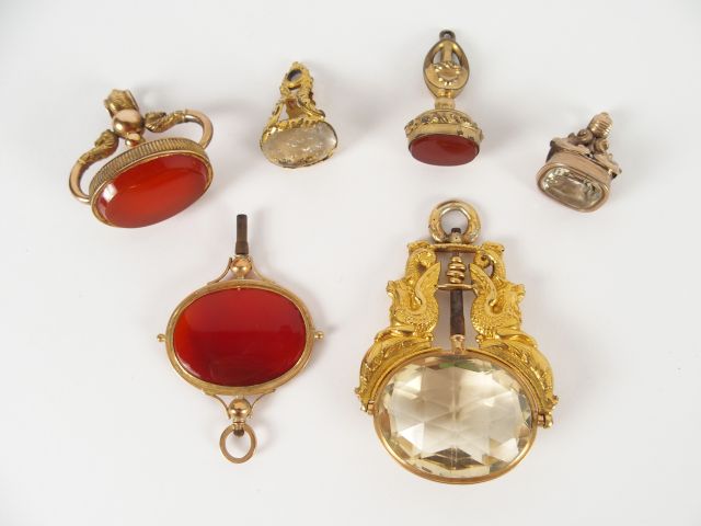 Collection de cinq cachets en pomponne et pierre dure. On y joint deux clés de montre en pomponne et pierre dure. L'ensemble du XIXème.