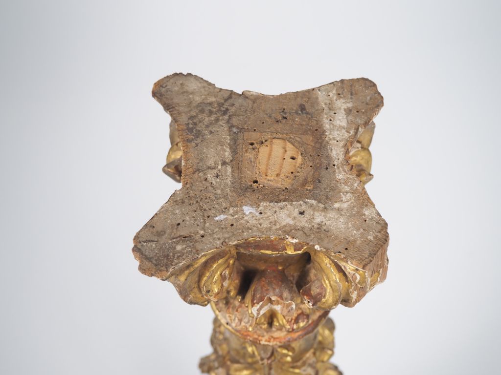 Colonne de style composite XVIIIème en bois sculpté et doré, à décor de feuillage et de fruits. Socle postérieur H. 88,5 cm (quelques sauts de dorure)