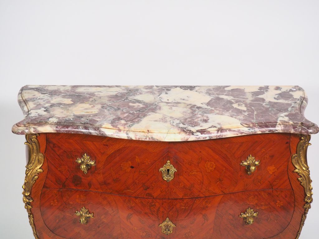 Commode de style Louis XV en marqueterie, à décor de fleurs, ornementation de bronze, ouvrant à deux tiroirs sans traverse, dessus marbre brèche. Dim. 82 x 46,5 x 108 cm