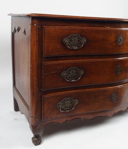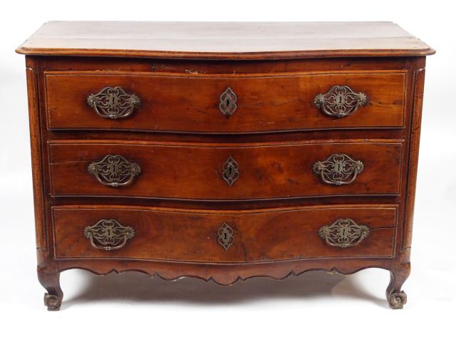 Commode Louis XV en merisier mouluré, ouvrant à trois tiroirs en façade, pieds coquille, dessus bois (restaurations).