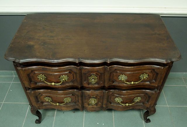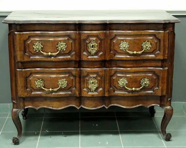 Commode Louis XV en noyer, ouvrant à deux tiroirs en façade, ceinture sinueuse, pieds galbés, façade à arbalète