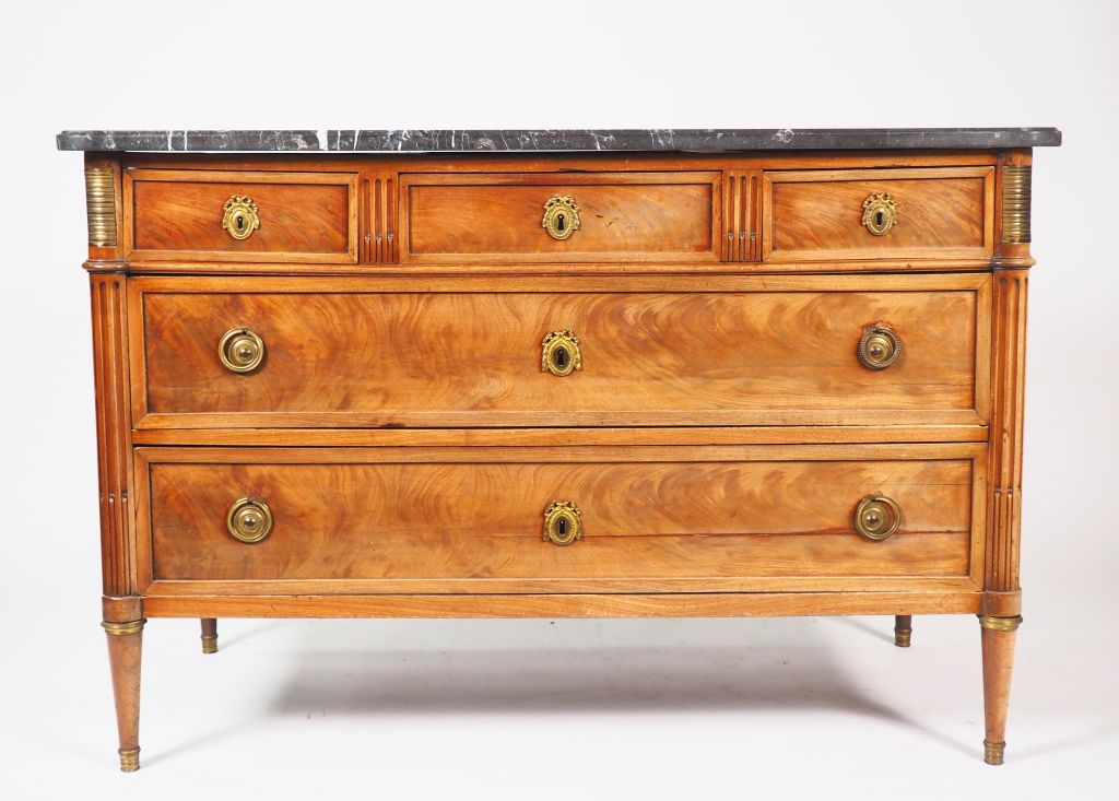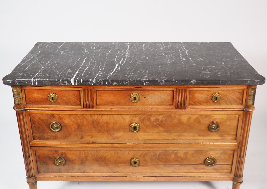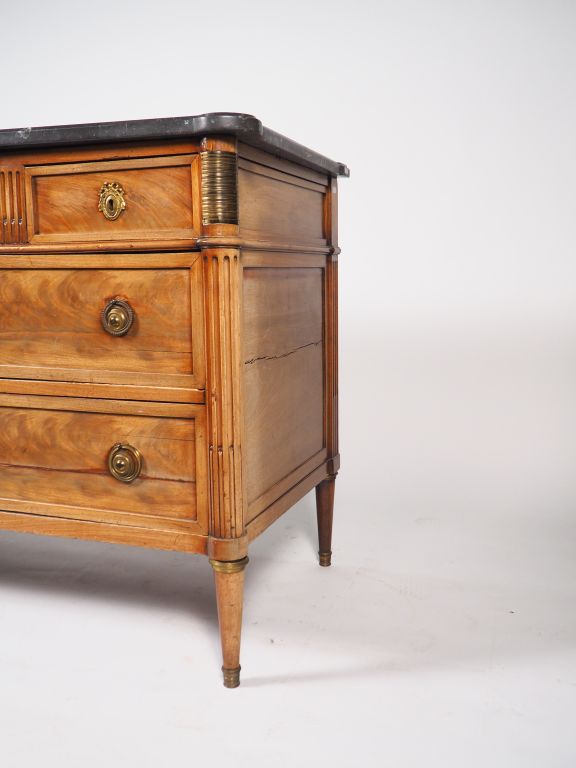 Commode Louis XVI en acajou, ouvrant à deux grands tiroirs en partie inférieure et trois petits tiroirs en partie supérieure, montants cannelés et rudentés, quatre pieds fuselés, dessus marbre gris. Estampillée Boichod. Dim. 89 x 134 x 61,5 cm