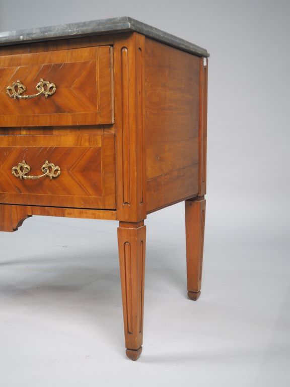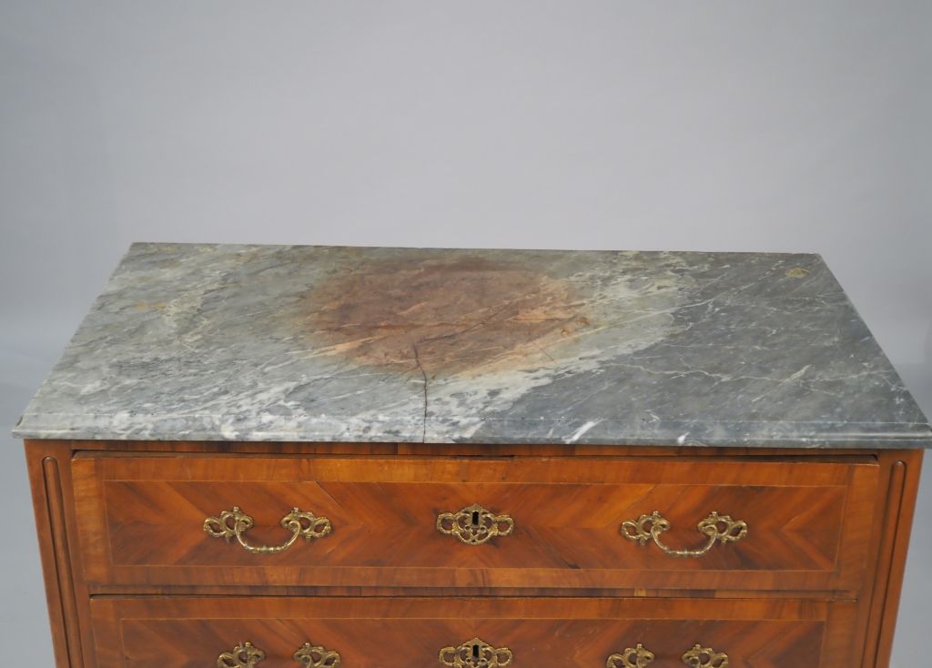 Commode Louis XVI en marqueterie, ouvrant à deux tiroirs, pieds fuselés, dessus marbre gris. Dim. 85 x 111 x 57 cm (marbre cassé)