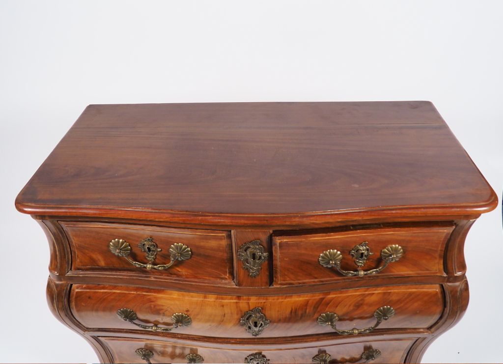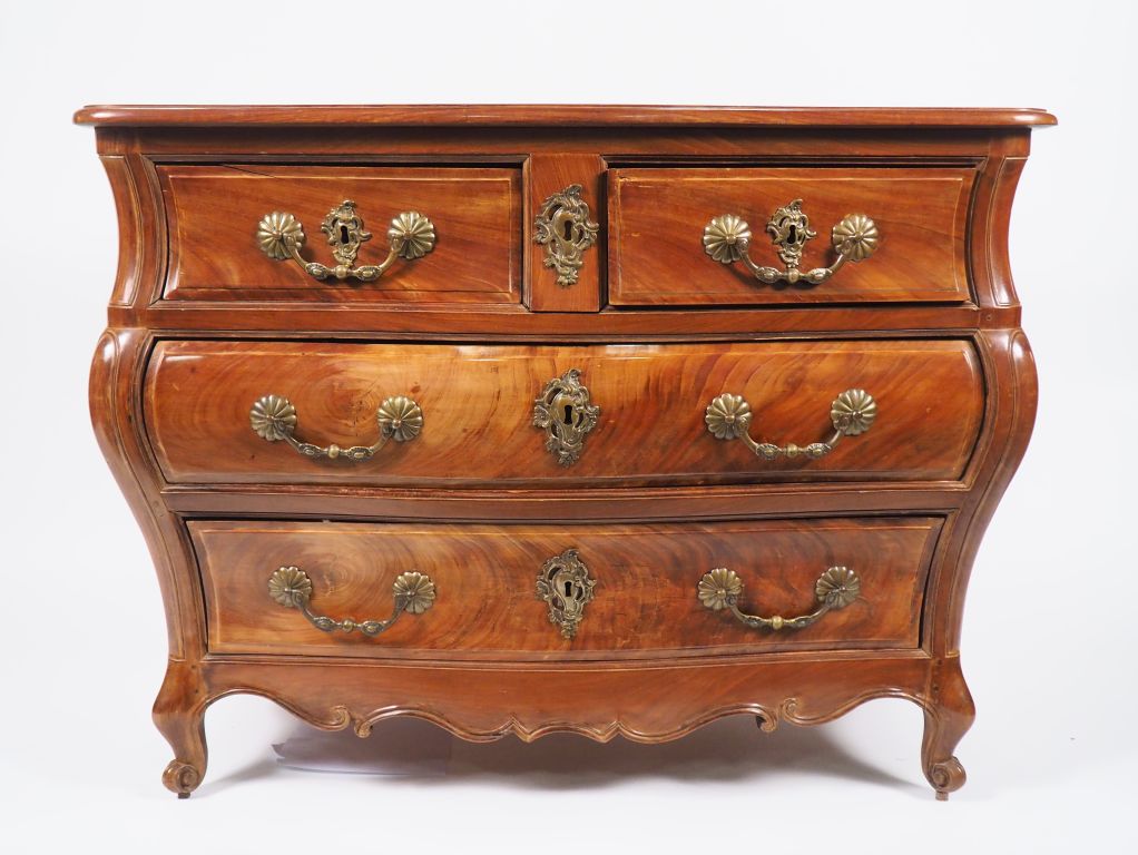 Commode tombeau, bordelaise Louis XV en acajou, ouvrant à quatre tiroirs sur trois rangs, dessus bois, ornementation de bronze. Dim. 81,5 x 109 x 60 cm.