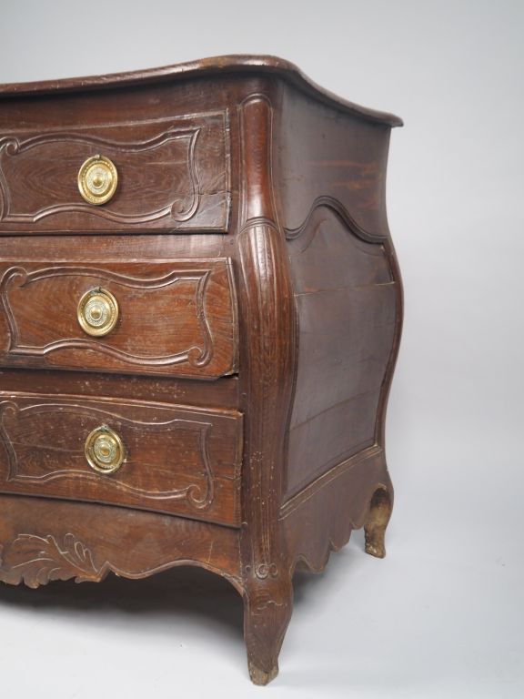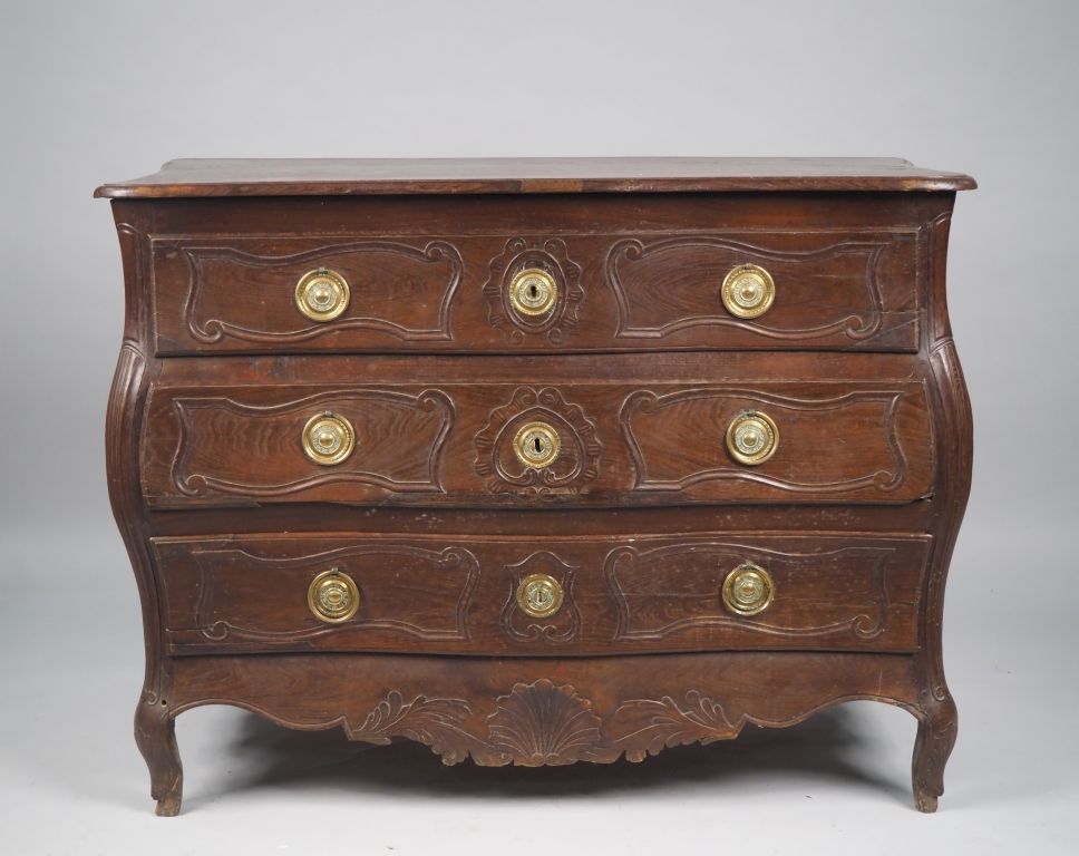 Commode tombeau Louis XV en bois naturel mouluré et sculpté, ouvrant à trois tiroirs en façade, pieds galbés. Dim. 95 x 125,5 x 63 cm