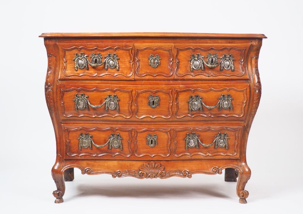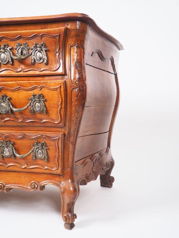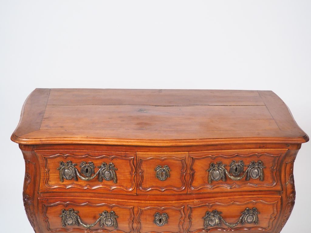 Commode tombeau Louis XV en merisier mouluré et sculpté, à décor de fleurs, ouvrant à deux grands et deux petits tiroirs, dessus bois. Dim. 82,5 x 115 x 64 cm