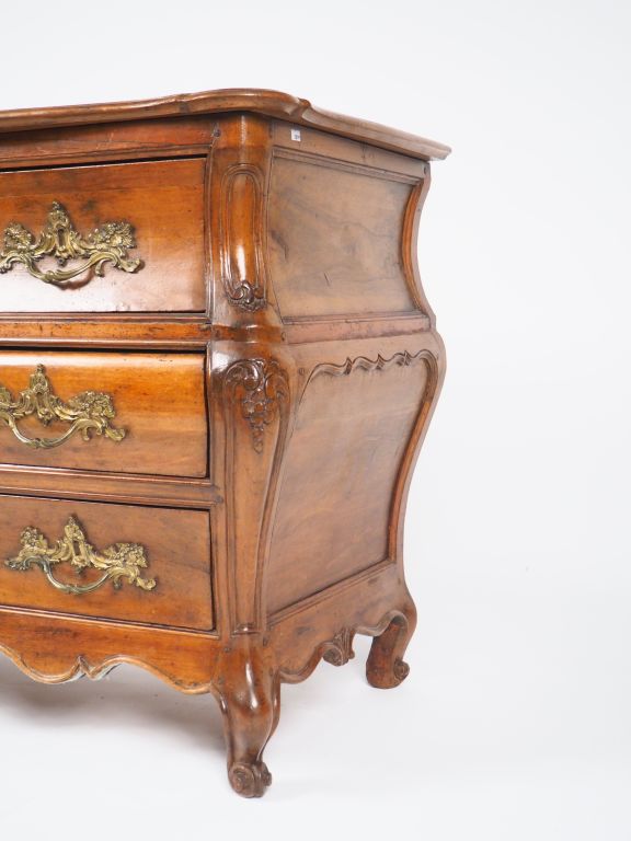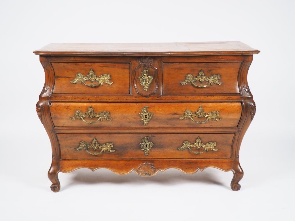 Commode tombeau Louis XV en noyer ouvrant à 4 tiroirs sur 3 rangs, dessus parqueté, galbée sur les 3 côtés, pieds coquille.