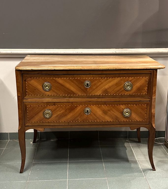 Commode Transition en marqueterie, ouvrant à deux tiroirs, dessus marbre brèche.