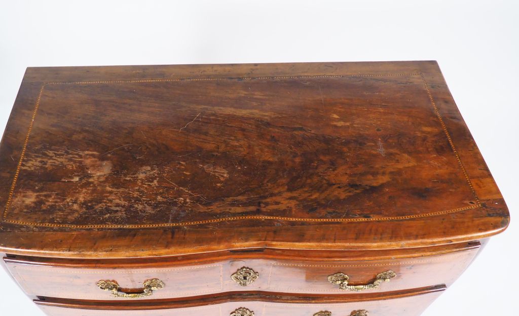 Commode Transition en marquetterie, ouvrant à trois tiroirs, dessus bois, ornementation de bronze. Dim. 83,5 x 115,5 x 58 cm. (plateau taché, une poignée détachée ).