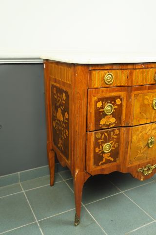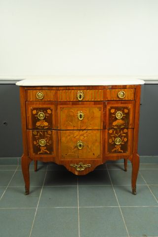 Commode transition Louis XV-Louis XVI en marqueterie, à décor de trophée de musique, de bouquets de fleurs et de cannelures en trompe l'œil, ouvrant à trois tiroirs sur trois rangs, dessus marbre blanc (manques et accidents). Estampillée Lardin. 91 x 94 x 52 cm