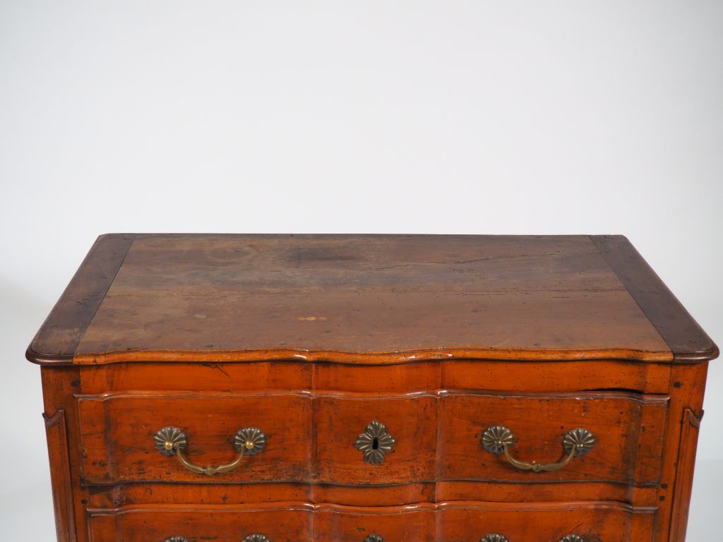 Commode XVIIIème en noyer, ouvrant à trois tiroirs en façade sur trois rangs, façade à arbalette, dessus bois. Dim. 83 x 109 x 60 cm