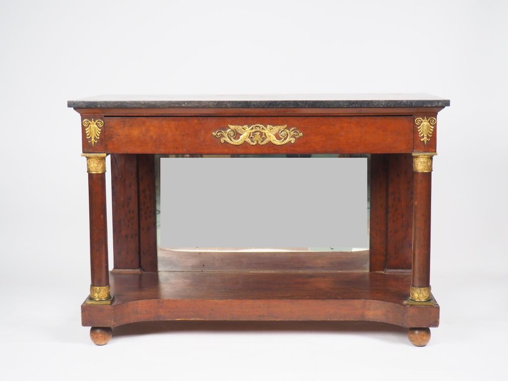 Console de style Empire en acajou et placage d'acajou, dessus marbre noir, ornementation de bronze doré. Dim.88 x 129,5 x 59 cm