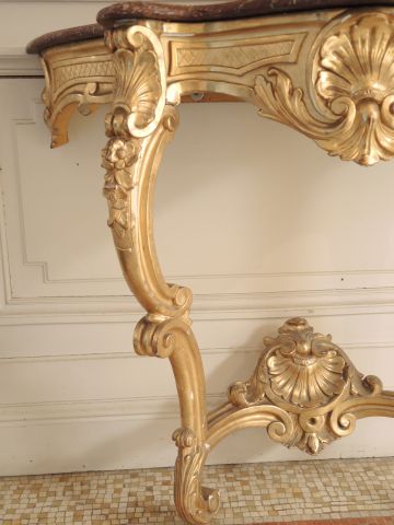 Console de style Louis XV en bois et stuc doré, à décor de palmettes et de fleurs, pieds à consoles affrontées réunies par une entretoise, dessus marbre rouge.