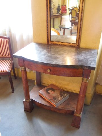 Console Empire en placage de noyer, pieds en forme de colonne et de pilastre, un tiroir ceintré en ceinture, dessus marbre gris