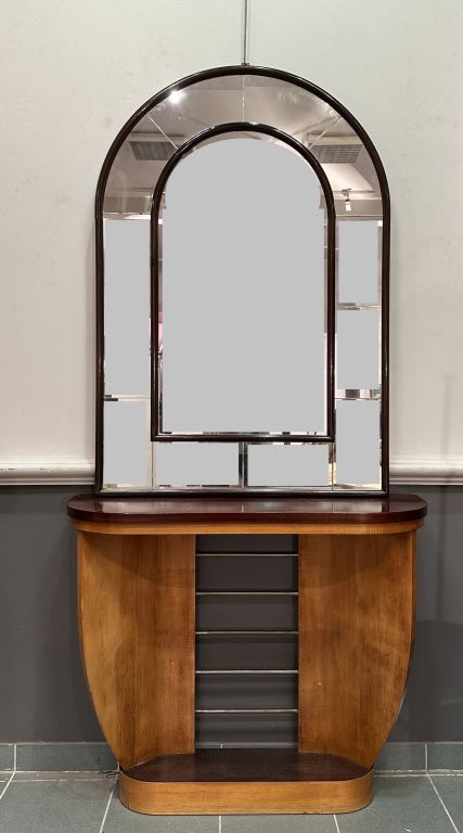 Console et glace de style 1940 en bois teinté bicolore. H. de la console : 82 x 100 x 32 cm H. de la glace : 123 x 85 cm