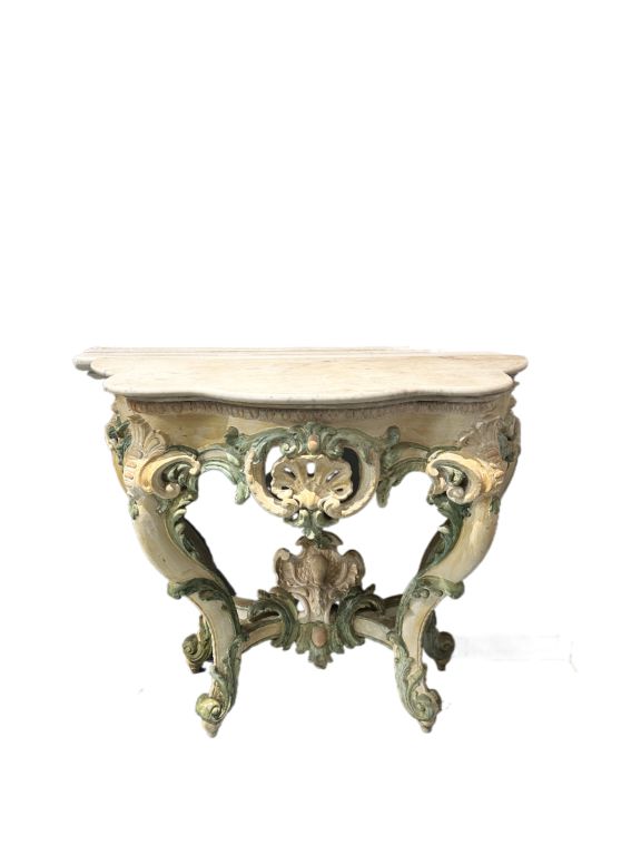 Console Napoléon III de style Louis XV en bois sculpté, ajouré, laqué gris et vert, décor ajouré de palmette, de rocailles et de feuillage. Dessus marbre blanc (accidenté) Dim. 91 x 47 x 104 cm
