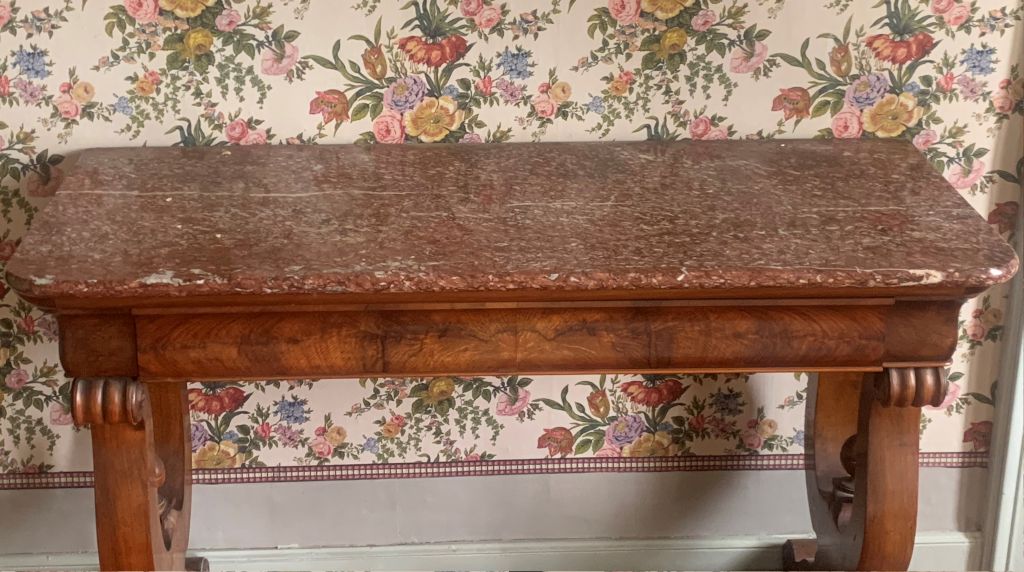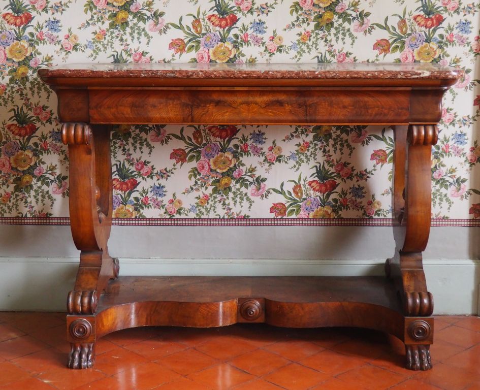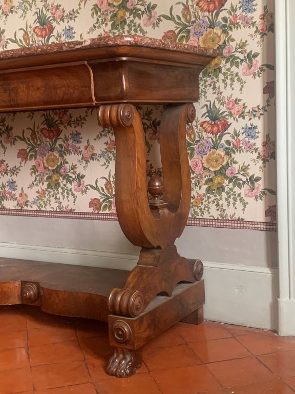 Console Restauration en noyer et placage de noyer ouvrant un tiroir à doucine, pieds en forme de lyre reposant sur des griffes et réunis par un plateau d’entretoise, dessus marbre rose (très beau modèle) Dim. 95 x 130 x 54,5 cm
