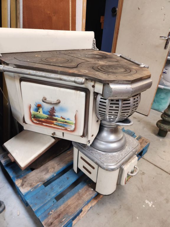Cuisinière ancienne à décor émaillé de paysages sur fond crème.