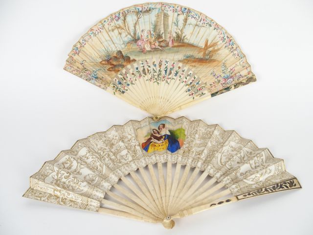Deux différents éventails en ivoire et nacre de style Louis XVI, à décor de scènes galantes.
