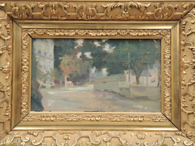 Ecole française vers 1900 « Le fumeur de narguilé » Huile sur panneau. 12.5 x 20 cm On y joint une étude de vue de village Huile sur panneau. 11 x 20.5 cm
