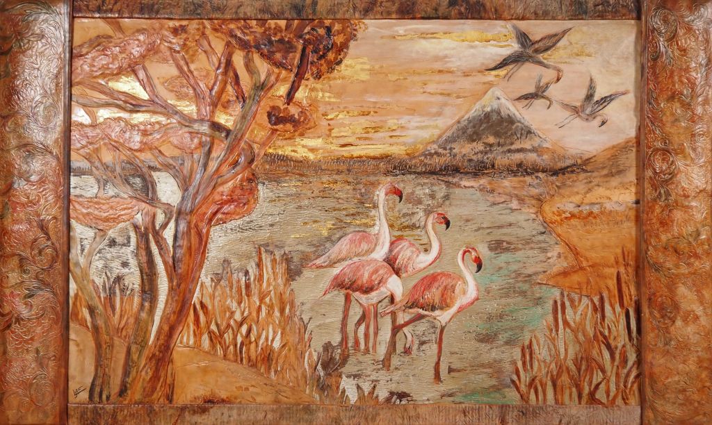 Ecole française XXème. "flamants roses dans un paysage lacustre" Grand panneau en cuir peint Dim. 110 x 186 cm
