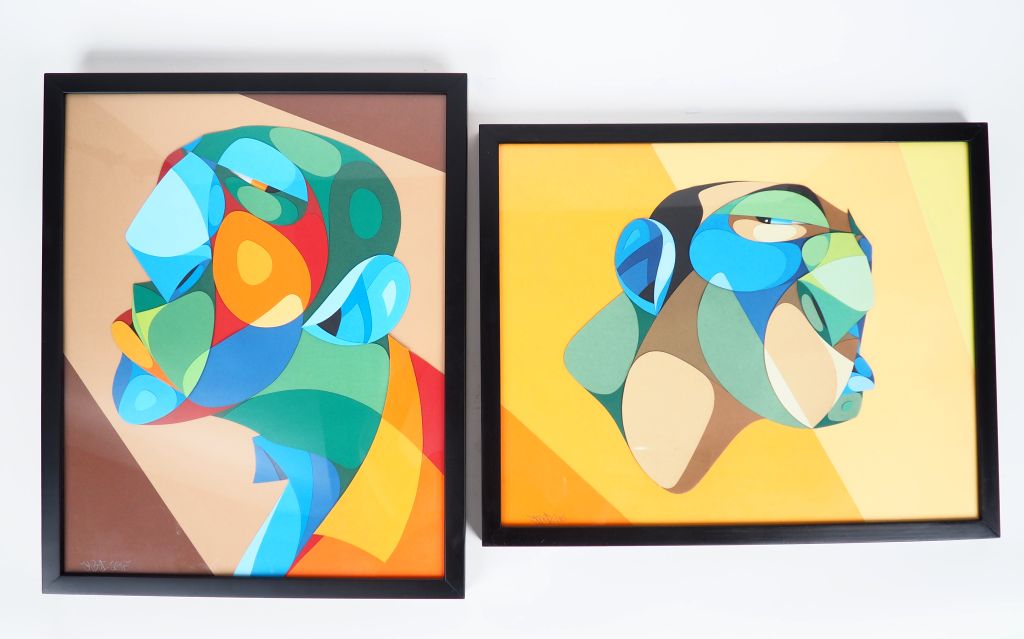 Ecole française XXème. "Portraits". Paire de collages signés et datés. Dim. 50 x 40 cm.$