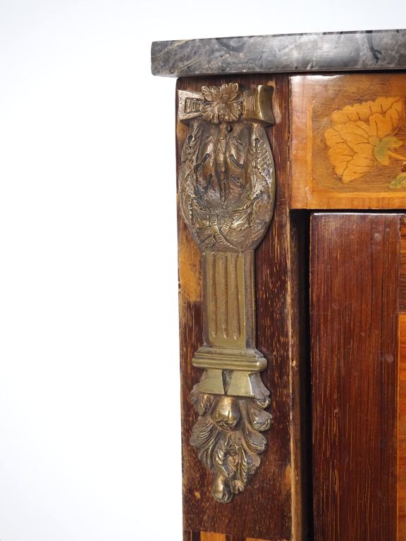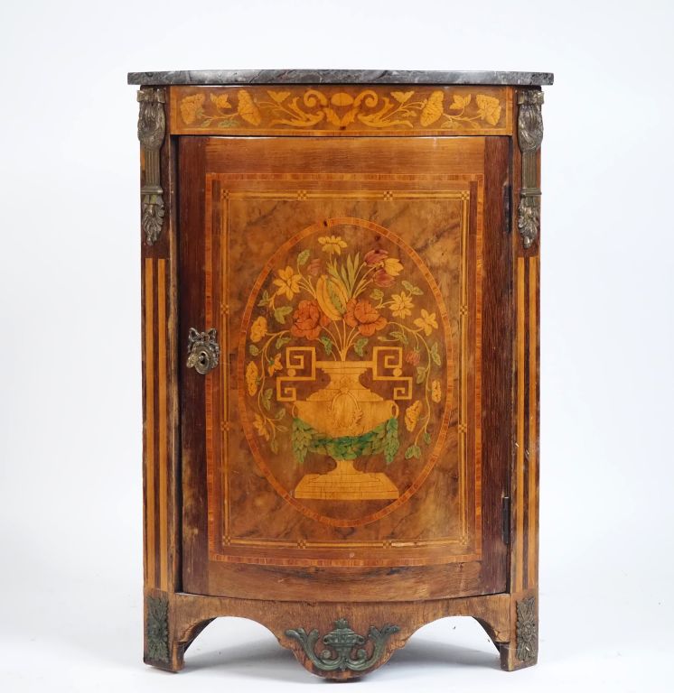 Encoignure de style Louis XVI en marqueterie ouvrant à une porte cintrée, dessus marbre gris, ornementation de bronze. Dim. 92 x 44,5 x 64 cm.