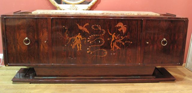 Enfilade 1940 en placage de palissandre et marqueterie à décor de personnages et d'oiseaux, ouvrant à quatre portes, dessus marbre jaune.