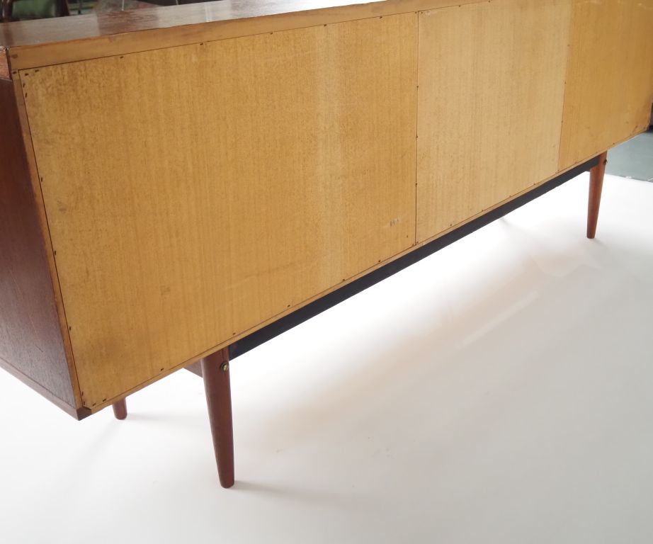 Enfilade scandinave en teck, ouvrant à trois tiroirs et deux vantaux coulissants. Dim. 68 x 200 x 44 cm