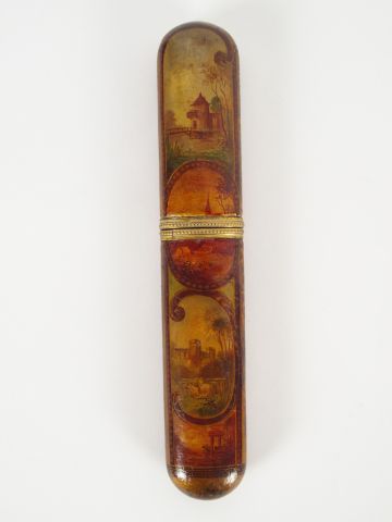 Etui de style Louis XVI en vernis Martin, à décor de scènes galantes, de paysages et de trophées. 14,5 cm
