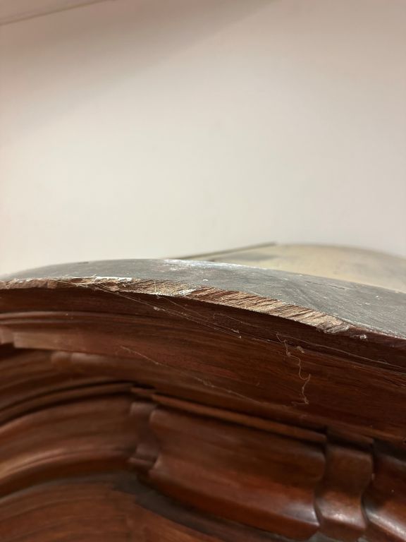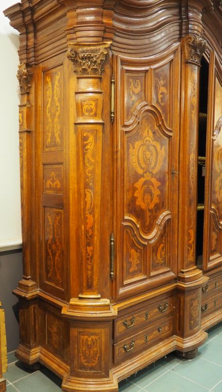 Exceptionnelle armoire alsacienne XVIIIème en noyer, placage de noyer et marqueterie, à décor de rocailles, de fleurs et de feuillage. Ouvrant à deux portes et quatre tiroirs, montants et dormants à décor de pilastres corinthiens, superbe corniche moulurée, (quelques petits manques et accidents). Dim. 270 x 200 x 74 cm
