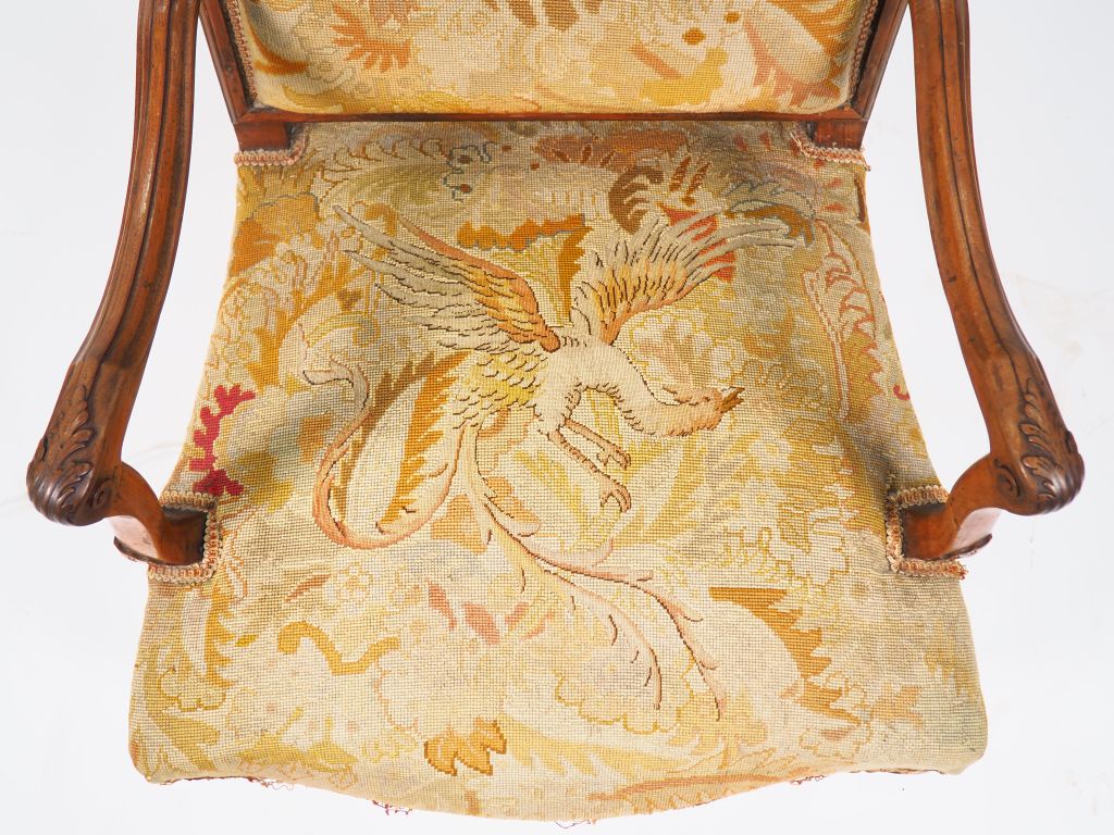 Fauteuil de style Régence en noyer mouluré et sculpté, à décor de feuillage, garniture de tapisserie.