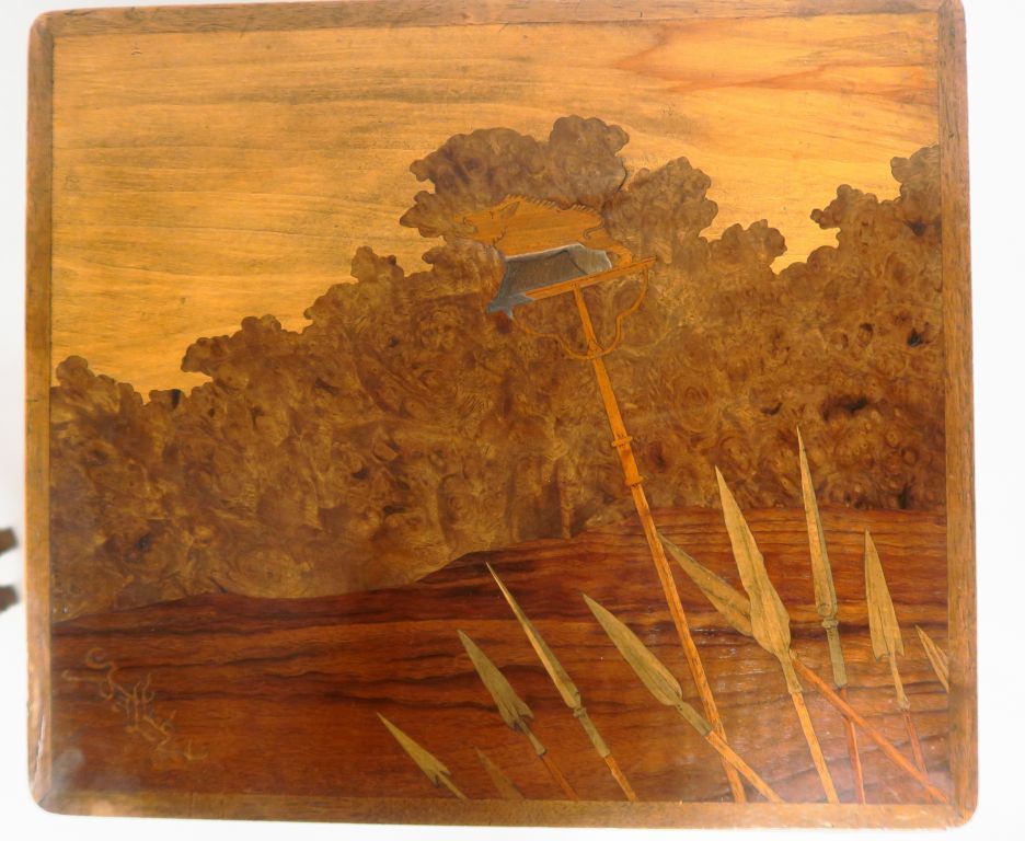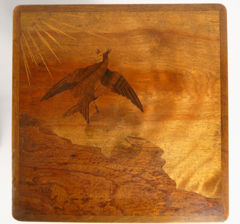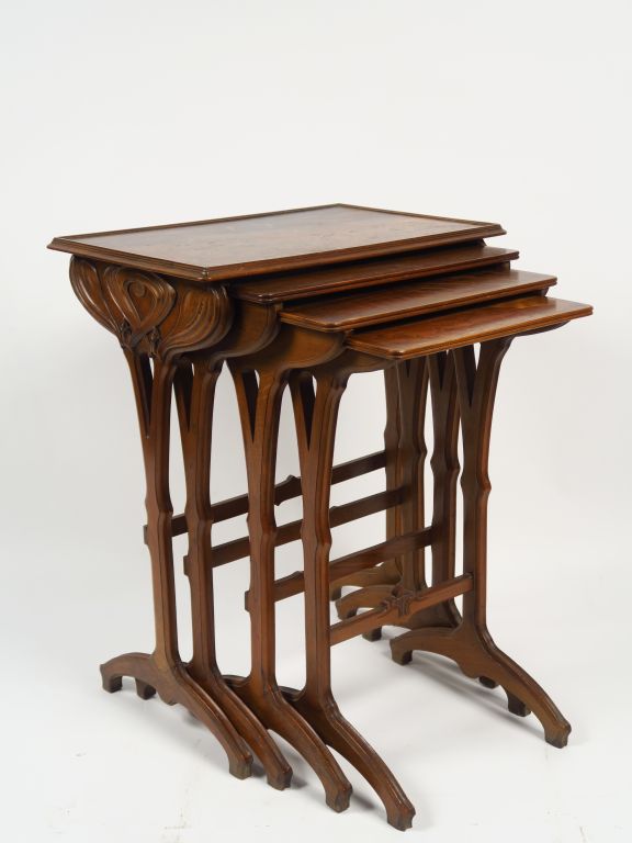GALLE. Suite de quatre tables gigognes en marqueterie, à décor de végétation et de symboles de l'armée romaine. Signées. Dim. 71,5 x 57,5 x 38,5 cm (un manque)